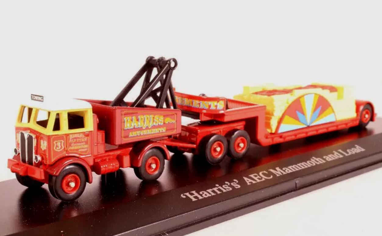 ATLAS 1/76 HU04 AEC MAMMOTH WRECK TRUCK/LOW LOADER TRAILER & LOAD HARRIS'S AMUSEMENTS