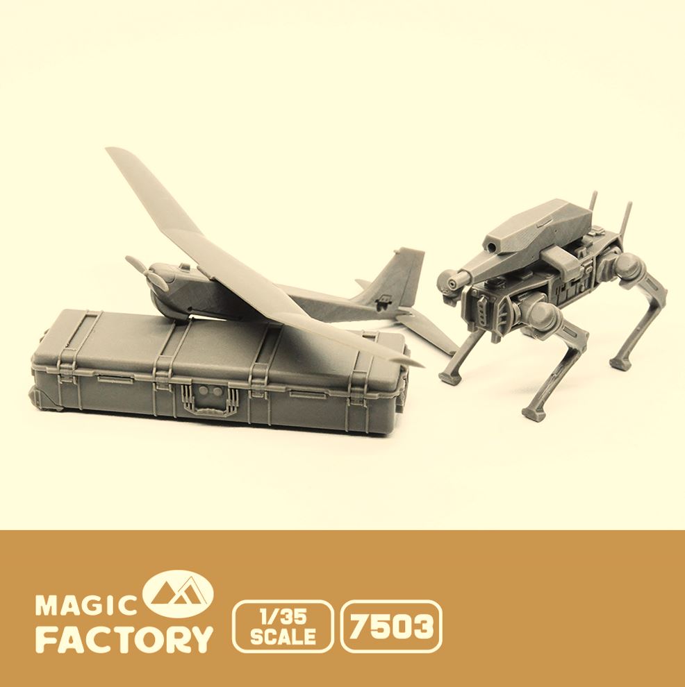 | 1/35 SCALE MODEL KIT | MAGIC FACTORY 7503 1/35 ARMED ROBOTS DOG AND RQ-20 UAV SET |