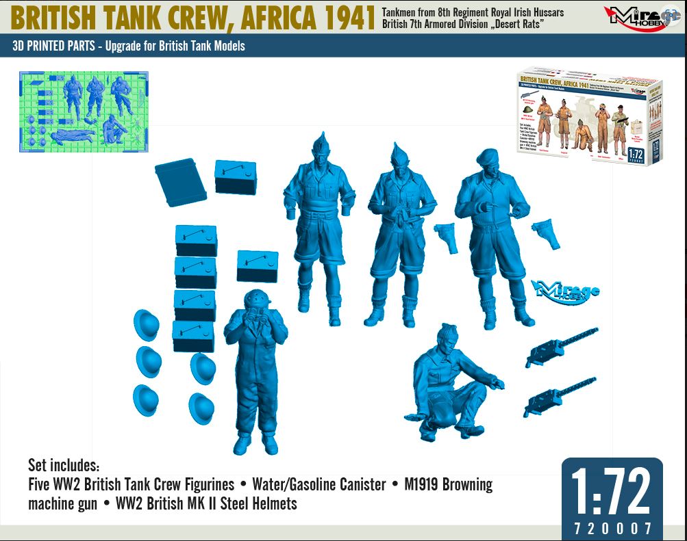 | 1/72 SCALE MODEL KIT | Mirage-Hobby 720007 1/72 3D Printed British Tank Crew, Africa 1941 7th Arm Div 8th Royal Irish Hussars. |